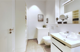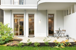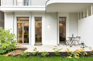 Ihr Appartement befindet sich im Erdgeschoss und ist barrierefrei von der Erdgeschossebene und auch direkt von der Tiefgarage zugänglich. Im Erdgeschoss vom Vorderhaus gibt es einen Service-Point, der einen Concierge-Service bietet. Dort werden Pakete angenommen und Besucher empfangen.
