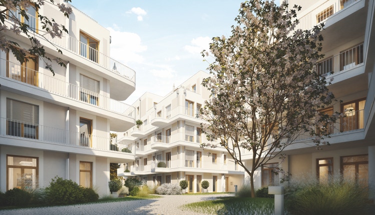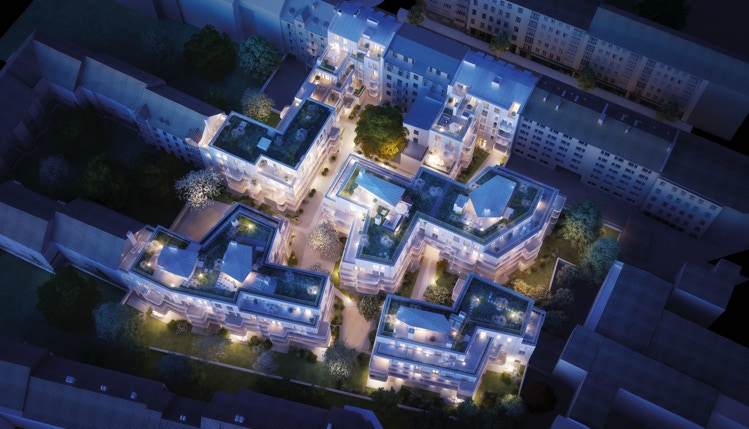 Auf dem ehemaligen Produktionsstandort der ARRI AG ist 2019 ein wohlüberlegtes Ensemble von Wohnungen entstanden, das sich in die gewachsene Nachbarschaft einfügt und eine Oase der Ruhe bietet.